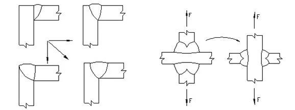 În îmbinările în formă de T și în formă de cruce, secțiunile de tranziție din oțel turnat sau oțel forjat sunt utilizate pentru a înlocui îmbinările în formă de T și în formă de cruce (e, f) cu îmbinări cap la cap;